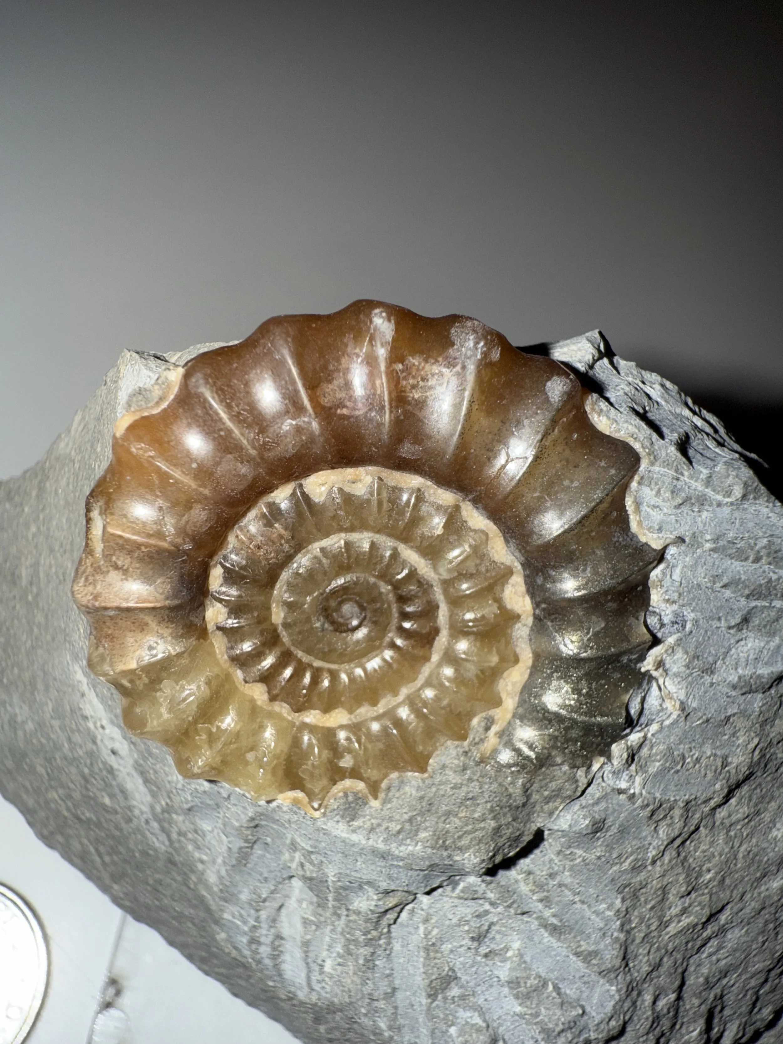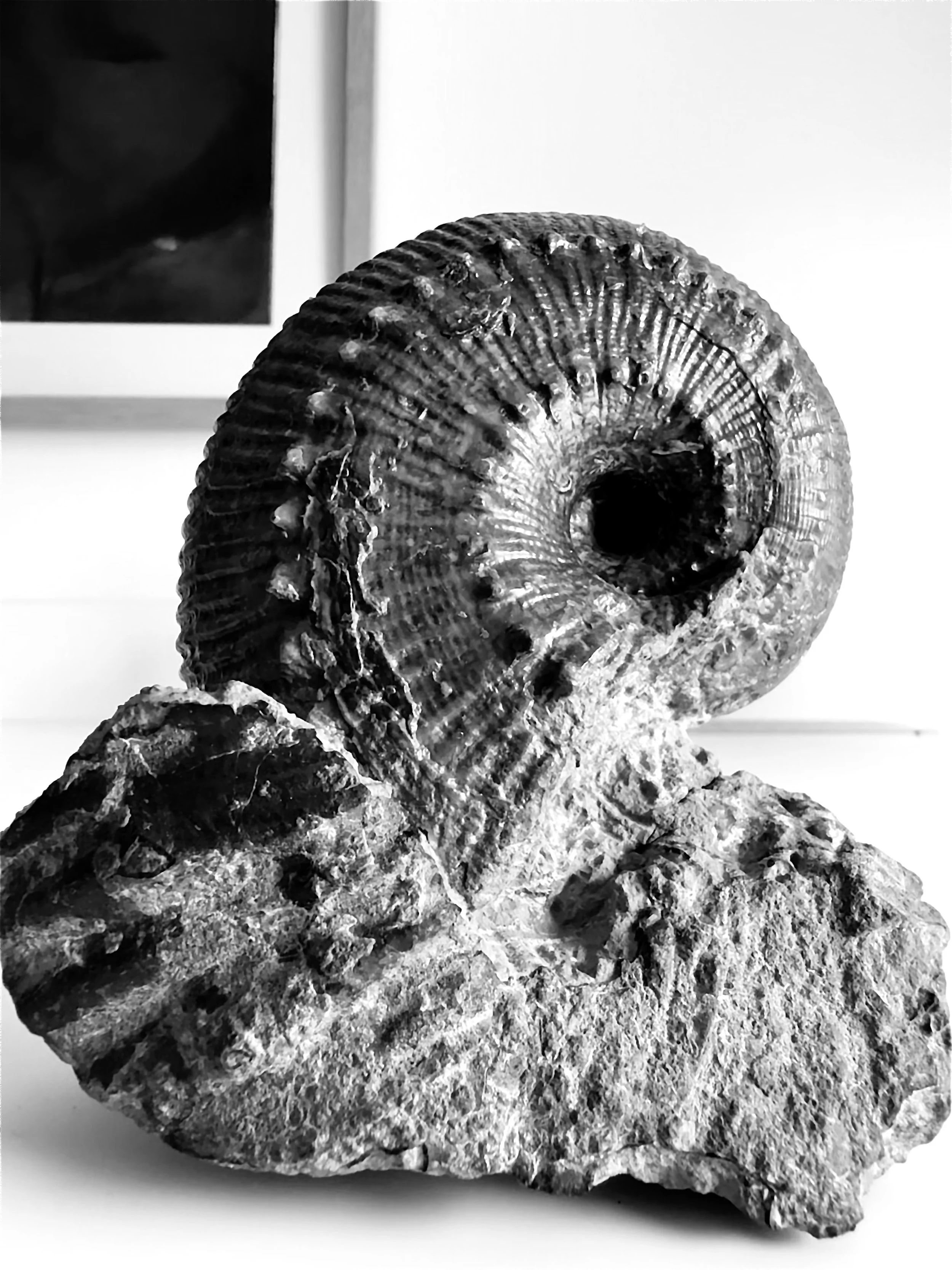 But while walking my dog along the beach, I stumbled across a fossil: a rare 5" Becheiceras gallicum ammonite, half-exposed in a mudslide. With a gentle wash in the sea, its dark shell revealed stunning ribbing and delicate spines. That single moment sparked a deep fascination with ancient life, deep time, and the sheer thrill of discovery.